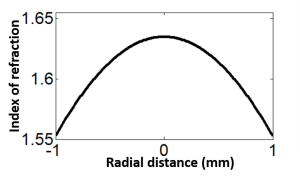 A nice overview of GRIN optics can be found on [[1]] (click on "Physics of SELFOC") and [[2]]. The most common use for GRIN lenses is for fiber coupling and light collimation and focusing. Aside from Grintech, all other GRIN lens manufacturers appear to produce GRIN lenses mainly for this use and not specifically for imaging. The index of refraction profile for most commercial GRIN lenses follow a second order expansion of a hyperbolic secant curve. The second order expansion (a parabola) is the ideal profile for on axis focusing of collimated light but has focusing issues of off axis light. Grintech uses an additional manufacturing step to add the fourth order expansion term of the hyperbolic secant to their index of refraction profile. The fourth order term improves off axis focusing which is very important for imaging applications. Theoretically there is not an ideal index of refraction profile for an imaging GRIN lens but the 4th order expansion term does a good enough job for imaging in our system.